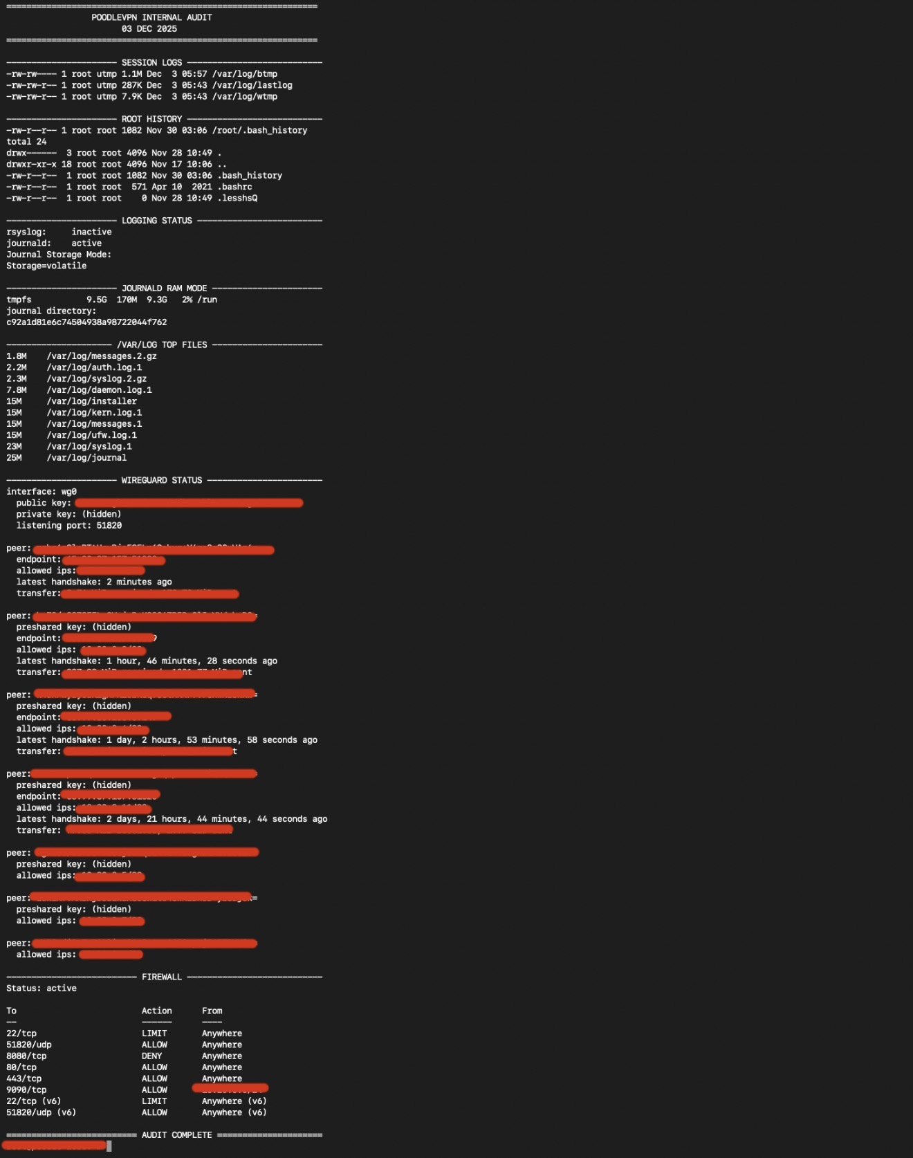 This page displays a transparency audit of a real PoodleVPN production server.